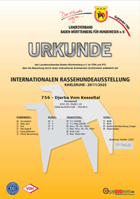 | 20.11.2023 | Djerba vom Kesseltal hat mit Franzi am 18.11.2023 bei den Hovawart-Freunde Babenhausen ihre IFH-V mit 92 Punkten bestanden. Herzlichen Glückwunsch !!!! | |
